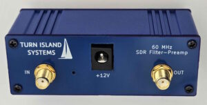 Here is the latest Filter-Preamp from Turn Island Systems! This is designed to complement the RX-888 and other SDR receivers that operate with a sample-clock around 130 MHz. These receivers will receive up to 60 MHz (including the ham six-meter band), but in many cases the receiver sensitivity and alias-filters are not as good as one might wish, leading to poor weak-signal performance and severe aliased spurious responses from the 88 – 108 MHz FB broadcast band and other signals above the 60 MHz Nyquist frequency.